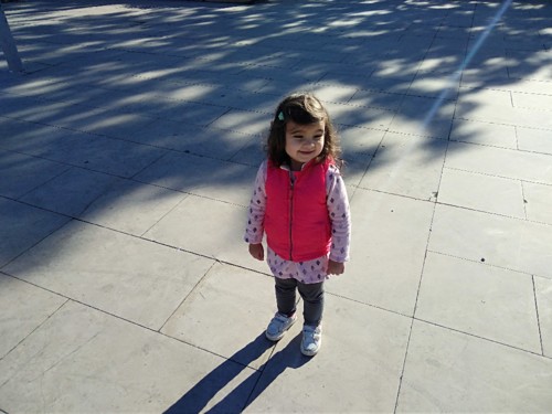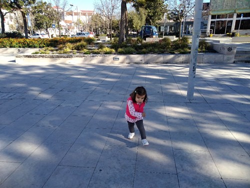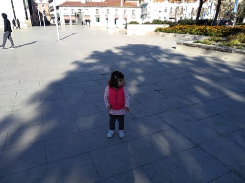 Pelo caminho fomos vendo diversas coisas que lhe chamavam atenção. Porque foi a primeira vez que a levei por aquele caminho para o parque. Geralmente descemos a avenida com lojas, que ela faz questão de parar nelas todas, para esmiuçar a montra toda. Então ficamos ali séculos infinitos a ouvi-la dizer "olha, uau, tão shiro? Vês papá!" E depois faz questão de mostrar a toda a gente e vai chamando a mamã, a mana, o mano, todos têm de ir ver a montra e aquilo que ela achou giro.